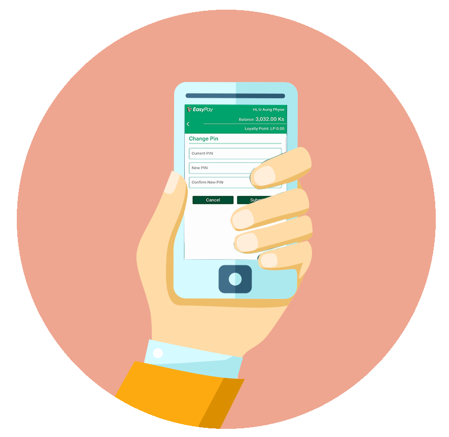 Register ပြုလုပ်ရာတွင် Myanmar Mobile Money-Easy Pay မှ ပြန်လည်ပေးပို့သော Message တွင် ပါဝင်သည့် PIN code သည် ဝန်ဆောင်မှုများကို အသုံးပြုရာတွင် လိုအပ်သောကြောင့် သေချာစွာမှတ်သားထားရန်လိုအပ်ပါသည်။ မိမိ အသုံးပြုသော PIN CODE လုံခြုံစိတ်ချမှု ရှိစေရန် PIN Code ကိုမိမိ အဆင်ပြေသော PIN code သို့ မဖြစ်မနေ ပြောင်းလဲပြီး အသုံးပြုပါ။)
